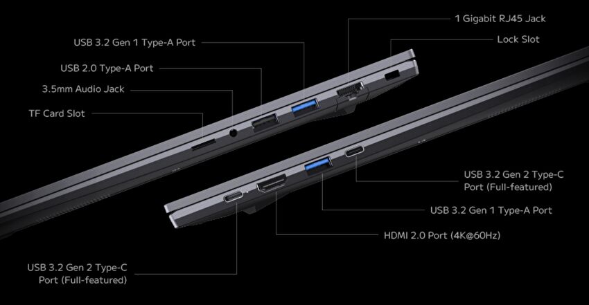 | ポート類 | USB Type-C 3.2 Gen 2(映像出力、充電に対応)x 2、USB-A 3.2 Gen 1 x 2、USB-A 2.0、HDMI、RJ-45 有線LAN、TFカードスロット |