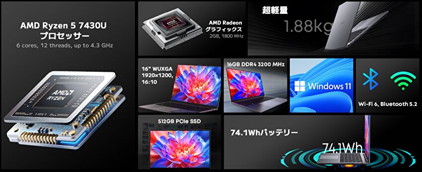 | CPU | AMD Ryzen 5 7430U、Zen 3 アーキテクチャ、6コア 12スレッド |