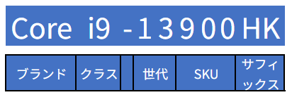 ▼インテル モバイル向けの末尾・サフィックスの指標は以下です。Core i9-13900HKはオーバークロック対応の「HK」ですが、実際にオーバークロックすることはないため、「H」とほぼ同じと捉えてよいと思います。