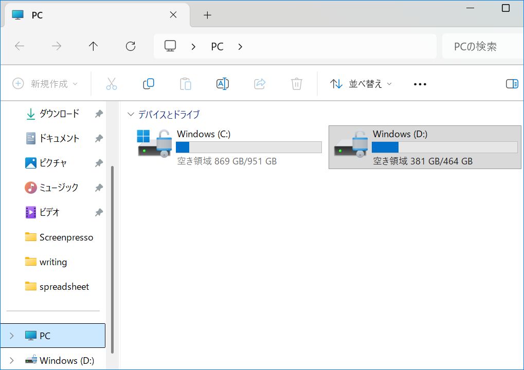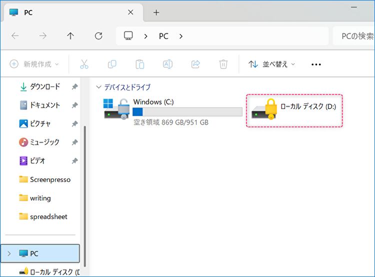 ▼以下のエクスプローラーの画像のとおり、外付けのDドライブにロックがかかっています。