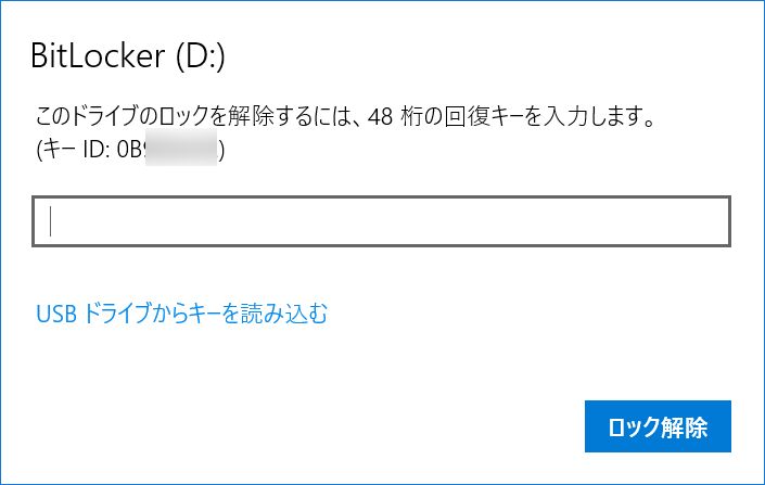 ▼Dドライブにアクセスしようとすると、以下の画像のとおり、BitLockerのロックによりアクセスできず、48桁の回復キーの入力を求められます。()にキーIDとありますが、これが重要なポイントとなります。後ほど、Microsoft サイトにて、該当するPCを識別する際に このキーIDにて行います。