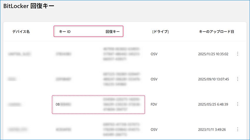 ▼上の「Microsoft アカウント、BitLocker 回復キー」にアクセスすると、以下の画面となります。私の場合、複数のWindows 11 PCを運用していますので、複数の回復キーが表示されています。前述のとおり、「キーID」がポイントとなりますが、私の事例の「キーID」は「0B始まり」。これを探して、(私の場合には点線赤枠の)該当するPCの回復キーをコピーします。