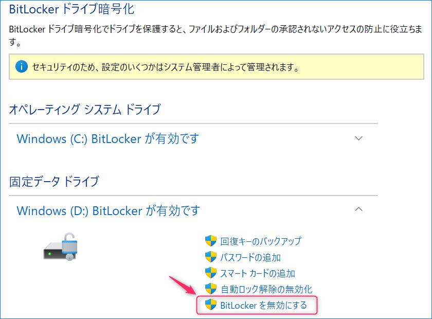 ▼Dドライブの事例ですが、「BitLockerを無効にする」を選択します。これにより、BitLockerを無効化できます。