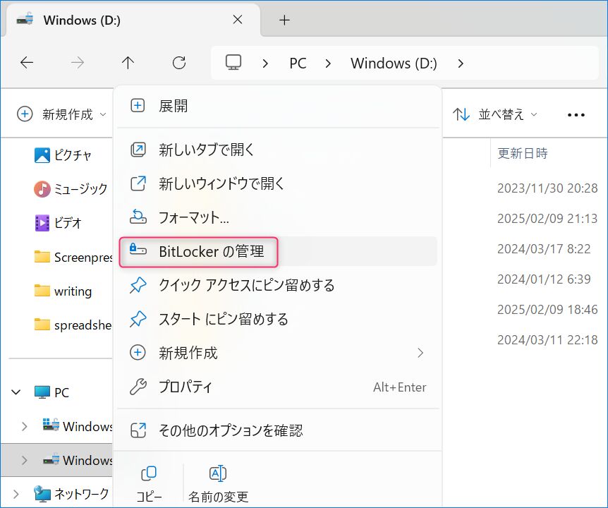 BitLocker ロック解除の手順を記載しますが、Dドライブなどの外付けドライブの場合にも、Cドライブにおける解除の手順と同じです。