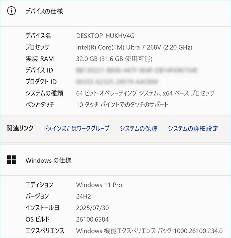 ▼Windows 11「設定」の「デバイスの仕様」と「Windowsの仕様」です。もちろん、製品情報どおりに、CPUはCore Ultra 7 268V、メモリ 32GB、OSは Windows 11 Pro。