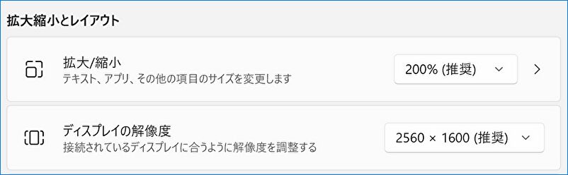 ▼13.3インチ 解像度 2560 x 1600の「拡大/縮小」の推奨は200%と、老眼(遠近両用コンタクトを装用)の私にも程よい大きさです。