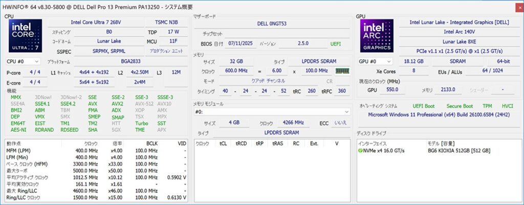 Dell Pro 13 Premiumのモデルとしては、CPUにCore Ultra 5 236V、Core Ultra 5 238V、Core Ultra 7 268Vを搭載するモデルがあります。デル アンバサダープログラムのモニターに参加し、お借りしたモデルは、Core Ultar 7 268Vを搭載するハイエンドモデルとなり、メモリは32GB オンボードです。また、13.3インチの液晶は、2.5K 解像度、タッチパネル、100%sRGBの広色域と豪華な仕様です。