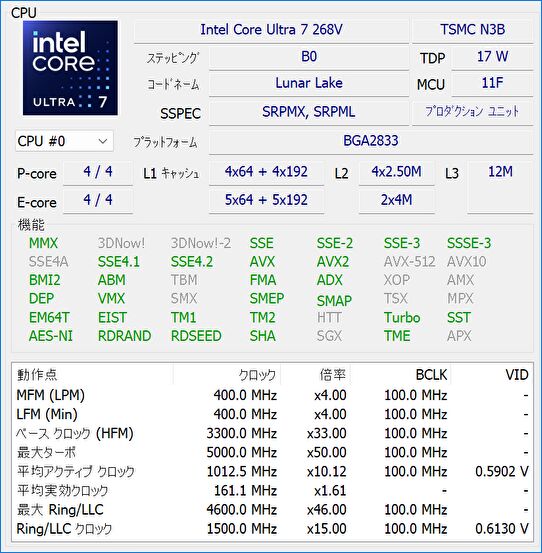 CPU | Core Ultra 7 268V、8コア(Pコア 4, Eコア4) 8スレッド |