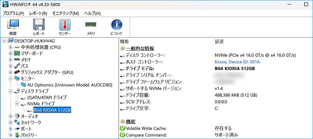▼512GB SSDの型番は「BG6 KIOXIA」。M.2 PCIe 4.0 SSDです。同SSDは国内通販では販売されていませんが、同型番で 2280サイズと2230サイズがあり、AliExpressでは 2230サイズが販売されています。同サイトでは、Read 4600MB/s、Write 3300MB/sとありますが、後述のベンチマークでは Writeでは指標以上の速度が出ています。