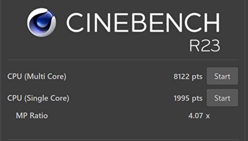 CINEBENECH R23のスコアは「シングルコア 1995、マルチコア 8122」。AMD Ryzen 9 8945HSよりもシングルコアのスコアは高い一方、マルチコアのスコアは Geekbench 以上に差が大きいです。