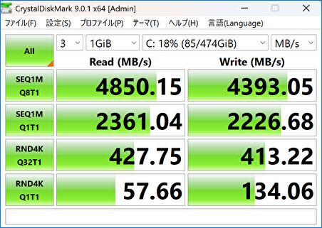 CrystalDiskMarkでの計測では、Read 4850MB/s、Write 4393MB/sとなり、このスペック帯のノートPCとしては標準的、あるいは標準よりやや高いスコアです。