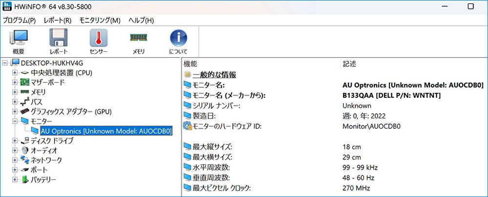 ▼13.3インチの液晶は、台湾の大手ブランド「AUO」製の型番「B133QAA」。Webで検索したものの、詳細情報を確認できず。