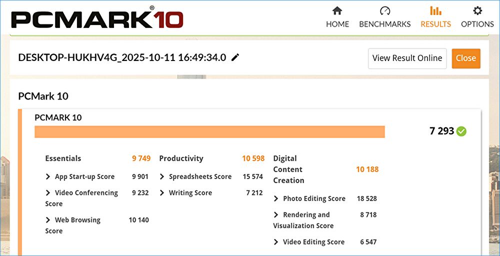 PCMark 10のスコアは 7,293。「一般的なオフィス作業や簡単なメディアコンテンツ制作向け」の Productivityの指標はスコア 4500ですが、本製品では 10,598と、かなり高いスコアです。AMD Ryzen 9 8945HSのスコア画像の掲載は割愛しましたが、 トータルスコアは6,954です。
