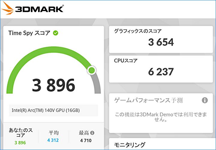 3DMark Time Spyのスコアは 3,896となり、AMD Ryzen 9 8945HSのスコアを大きく上回っています。インテル Core Ultra シリーズ2では、統合型GPUの性能が大きく向上しています。