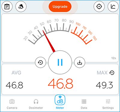 ▼iPhone アプリ「デジベル X」での測定ですが、同じく 負荷をかけた際のファン音量は 平均約47dB。やや喧しさを感じる音量ですが、前述のとおり、負荷を抑えた場合には即静音となります。