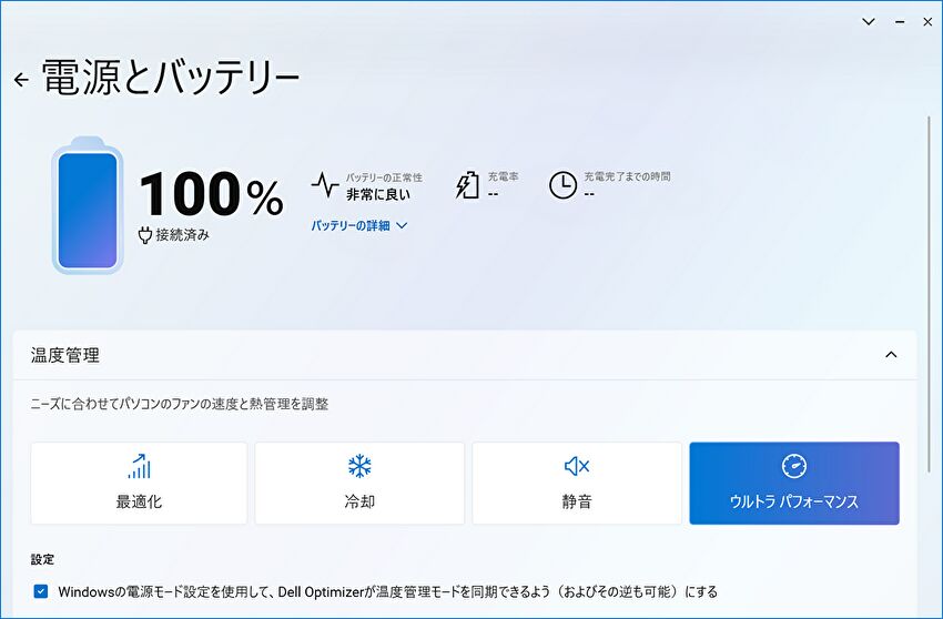 ▼プレインストールのソフト「Dell Optimizer」にて、PCのパフォーマンスモードを切替できますが、以下のベンチマークは「ウルトラパフォーマンス」の設定での計測です。