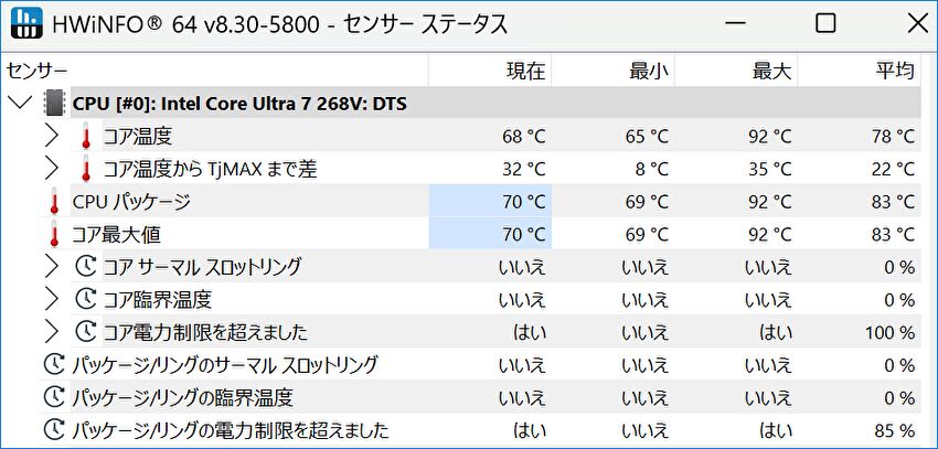 ▼CPU使用率を100%とした際のCPU 温度は、最大 92℃。高めの温度ですが、これほどまでに負荷をかけることは少ないため、また、通常は静音であるために、気にする必要はないとの認識です。