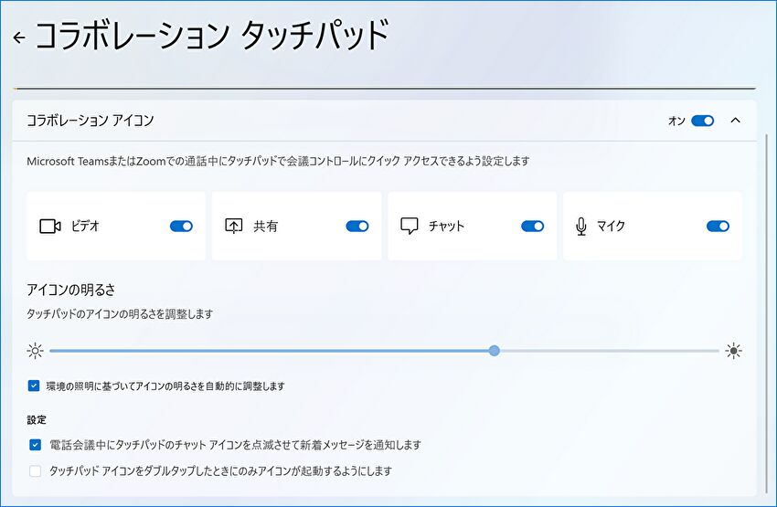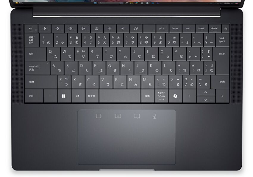 ▲▼上のタッチパッドにマイクなどのアイコンがありますが、Dell Optimizer アプリを通じて、以下のコラボレーション タッチパッドを通じて機能するもの。今回のレビューにおいては試していませんが、「Microsoft Teams またはZoomでの通話中に、タッチパッドで会議コントロールにクイックアクセスできるよう設定します」とあります。