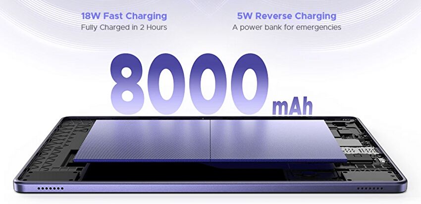▼8000mAhのバッテリーは、スマホや上位のタブレットと比較すると控えめながらも 18Wの急速充電に対応しています。また、5Wのリバースチャージングにも対応しています。これにより、Bluetooth イヤホンなどを充電することができます。