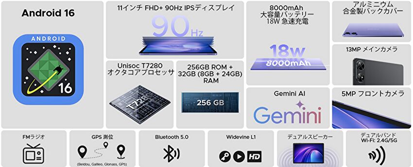 その他 | Widevine L1に対応、顔認証に対応、2スピーカー、GPS 搭載、金属製の筐体 |