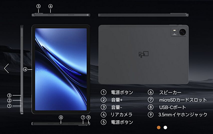 ▼4スピーカーは、横持ちでの左右両サイドに2個づつ配置されています。⑨の位置に 3.5mm イヤホンジャックを装備していることもポイントの一つです。なお、背面は金属製となり、中央のロゴは大きく主張せずに好感のもてるもの。