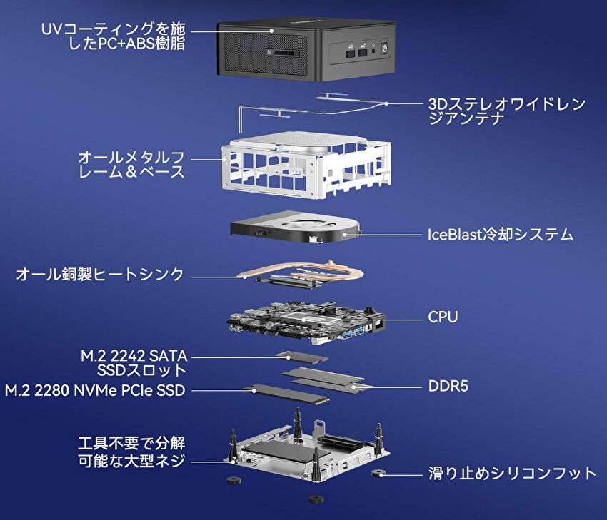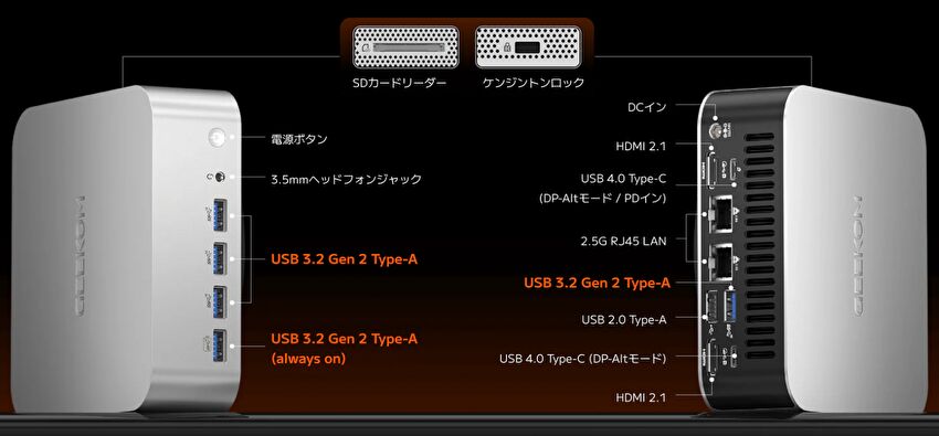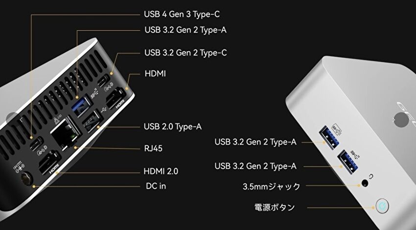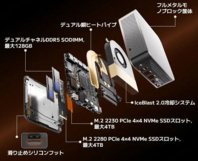 「A8」は同CPUを搭載する他社の製品と異なり、SSDの増設不可、「GMKTec」や「MINISFORUM」のミニPCでの搭載事例の多い OCulink ポートを未装備ですが、112mm 幅のコンパクトな筐体は高品質なアルミ製です。