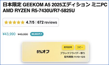 2025年11月10日から12月2日まで、GEEKOM 公式ストアにて ブラックフライデーセールを開催中です。期間中、毎日1製品の限定値下げを開催、その他の製品においても、Amazonなどの通販よりも低価格で販売中です。今回はこれらのセール対象のミニPCより、特におすすめの製品をピックアップしました。