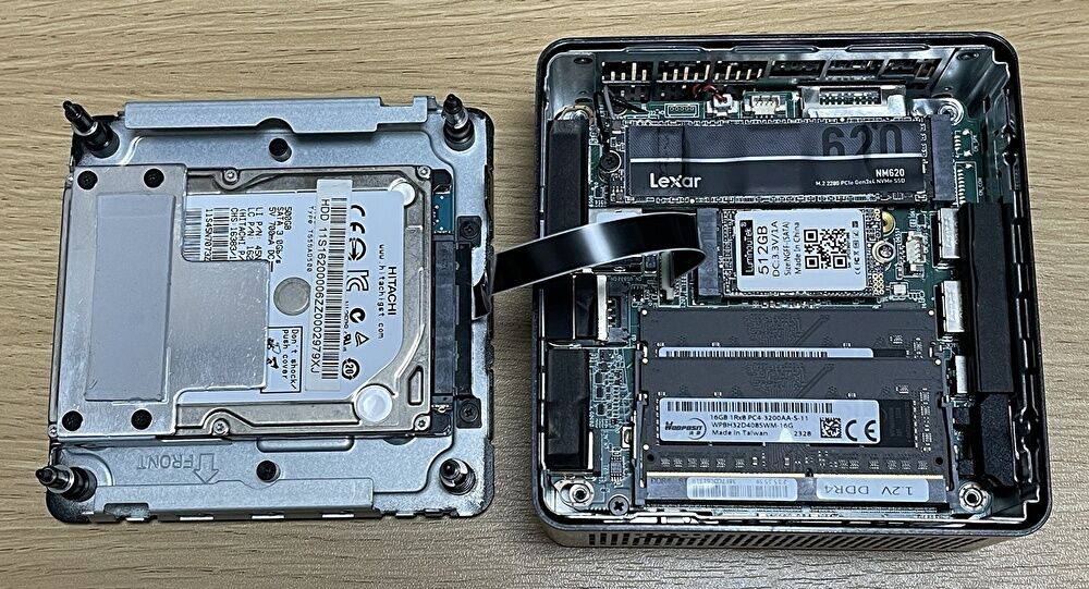 また、以下の写真の私が所有する「A5、Ryzen 7 5800Hモデル」と同様に、SSDを合計3基(標準装備のPCIe SSDのほか、2.5インチ SATA SSDと2242サイズのM.2 SATA SSDを増設可能)搭載することができます。