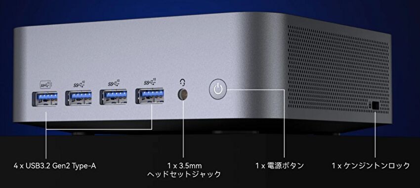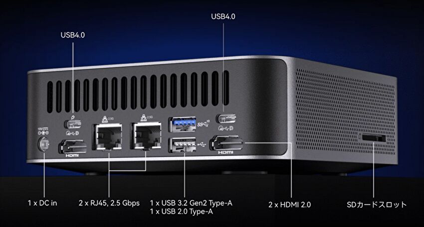 | ポート類 | USB4 x 2、USB-A 3.2 Gen 2 x 5、USB-A 2.0、HDMI x 2、2.5G RJ45 有線LAN x 2、SD カードスロット |