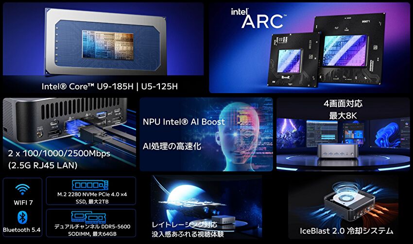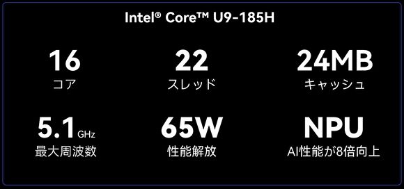 | CPU | Core Ultra 9 185H、16コア 22スレッド、最大 5.1GHz |