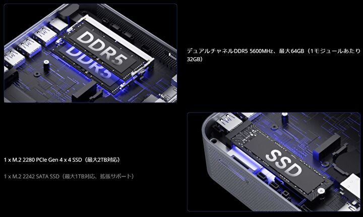 | ストレージ | M.2 2280サイズ PCIe 4.0 SSD 1TB、M.2 2242サイズ SATA SSDを増設可能 |