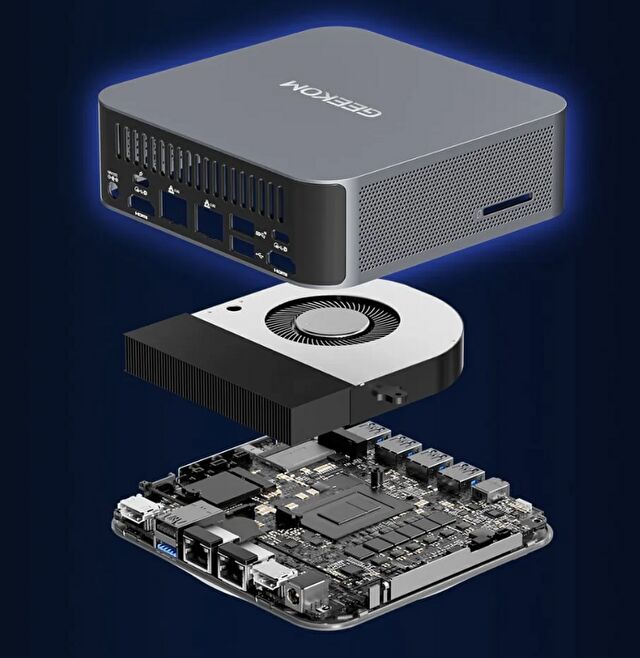 ▼同社の多くの他製品と同様に、アルミ製の高品質な筐体を採用しています。このクラスの他社製品では、CPUファンとシステムファンの2つのファンを装備する端末が多いなか、GEEKOMの製品は本製品も含めて シングルファンでの対応が多いです。