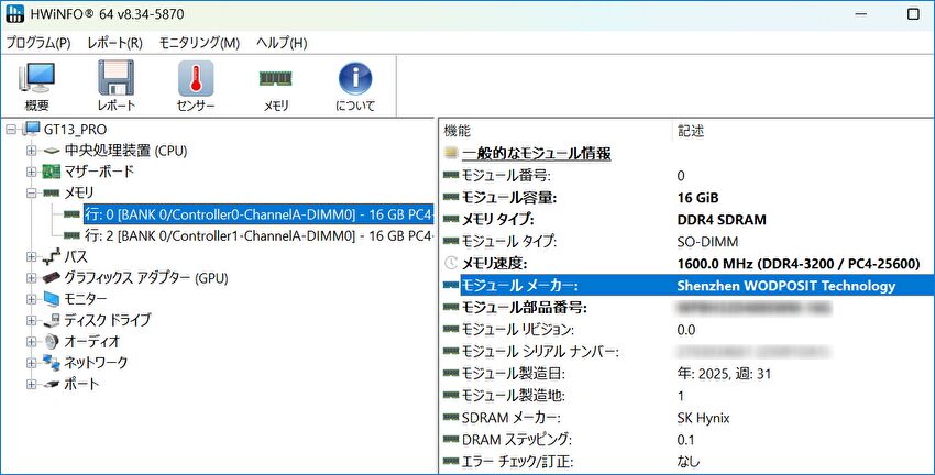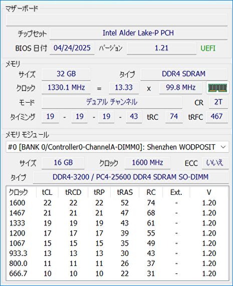 ▼メモリはDDR4 16GB x 2の32GB、デュアルチャンネルでの動作です。