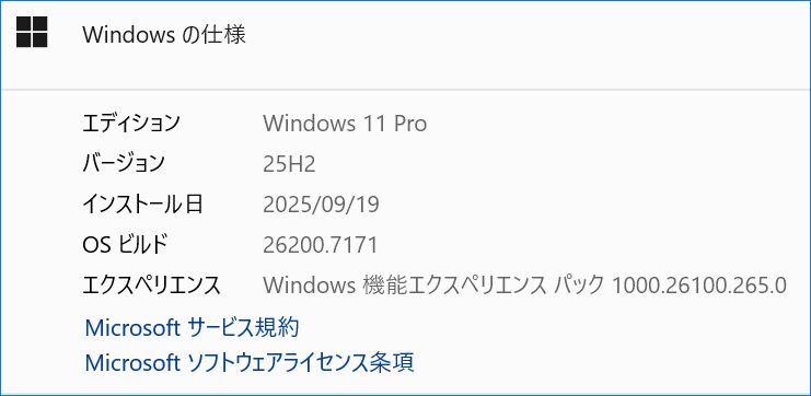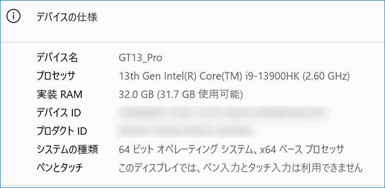 ▼Windows 11「設定」の「デバイスの仕様」と「Windowsの仕様」です。もちろん、仕様どおりに CPUはCore i9-13900HK、メモリは32GB、OSは Windows 11 Pro / バージョンは最新の25H2。初期設定時のWindows 11 Proのインストール・更新などで、2時間程度を要したとの記憶です。