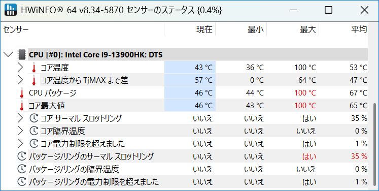 ▼CPU使用率を100%とした際には、CPU 温度が100℃となり、サーマルスロットリングが発動しています。