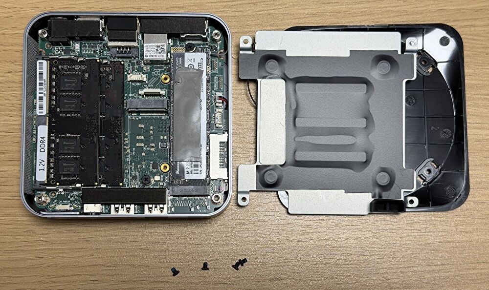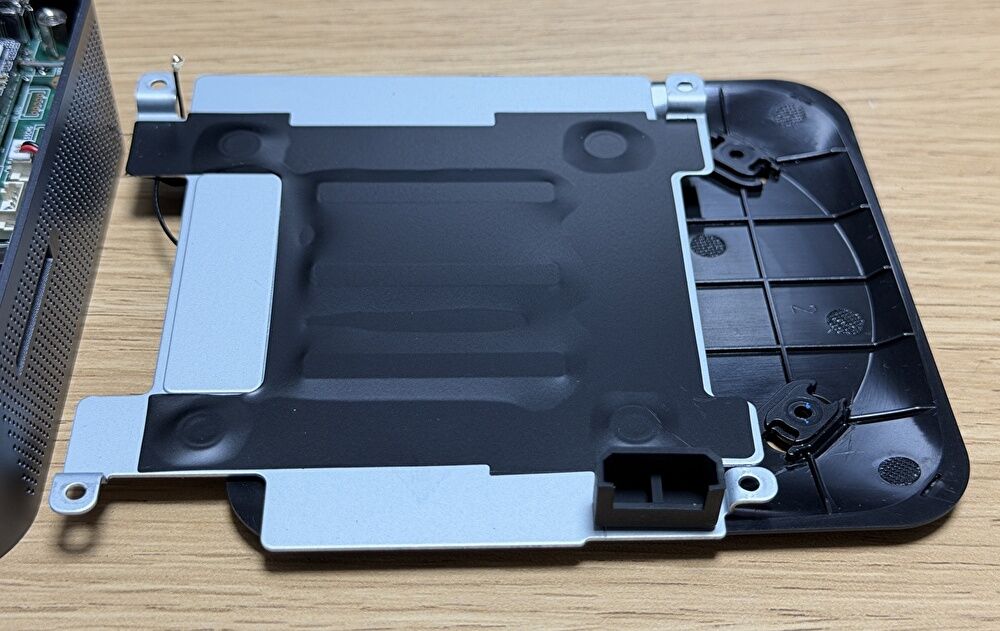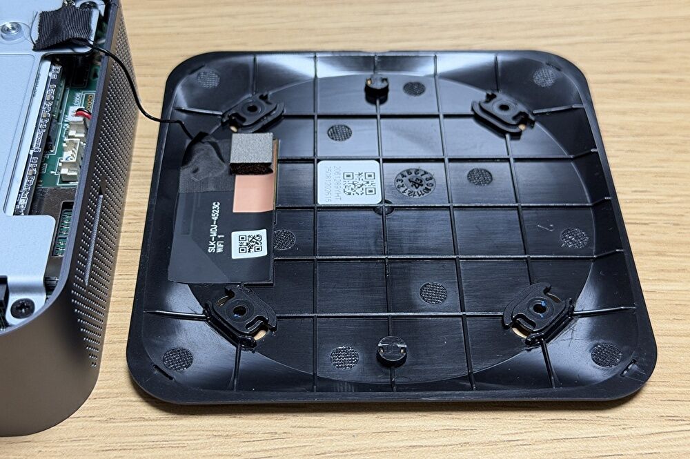- 底板を開けると、内部にSSD 冷却用の金属板があり、底板のネジはこの金属板に固定されています。なお、底板には WiFi モジュールの細いケーブルが固定されており、勢いよく底板を外すと、WiFi モジュールのケーブルの接続端子側が外れてしまうために注意が必要です。私は外してしまいましたが、小さな端子であり、再接続に多少の時間を要します。