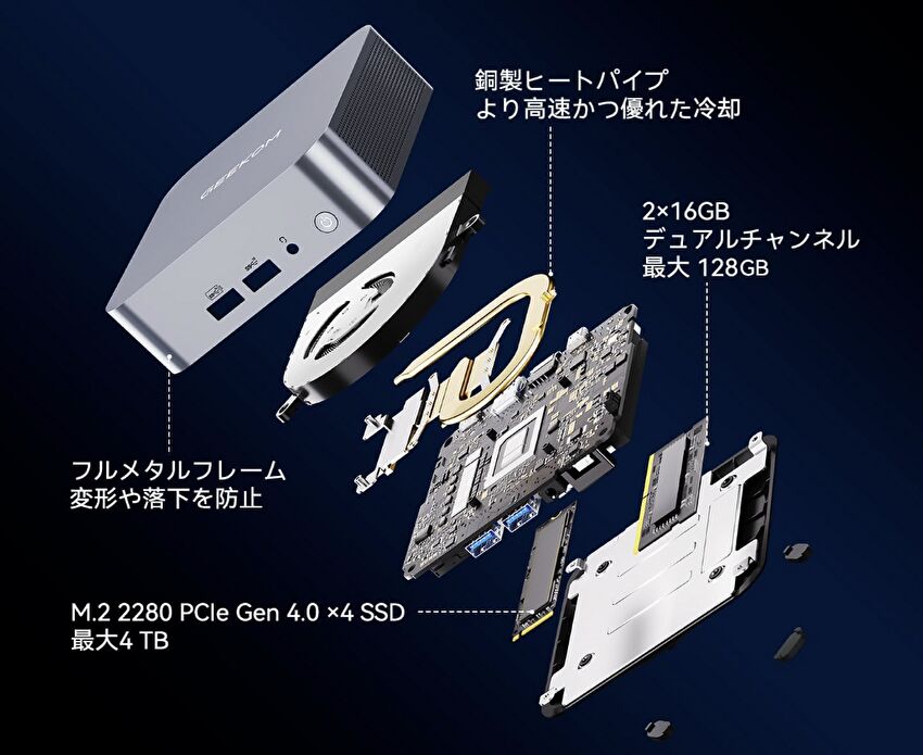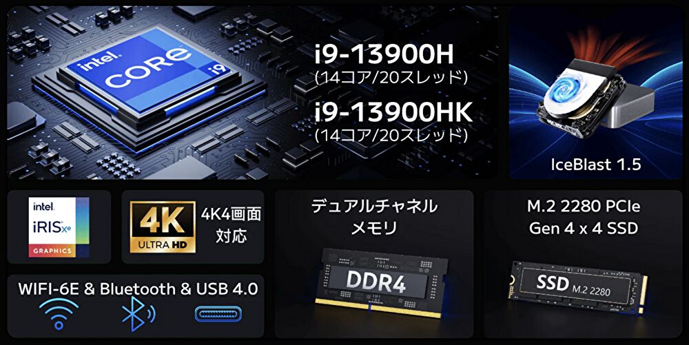 112.2 x 112.2 x 38mmとコンパクトで アルミ製の高品質な筐体に、インテル 第13世代 モバイル向けハイエンド、14コア 20スレッドのCore i9-13900HKを搭載し、メモリは16GB x 2の32GB、M.2 PCIe 4.0 1TB SSDは Read 7079MB/sと高速です。