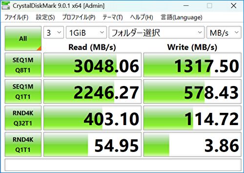 - M.2 PCIe SSDの読み書き速度(CrystalDiskMark)は、私がこれまでにレビューした市販のPCでのセット品としては、最も高速です。