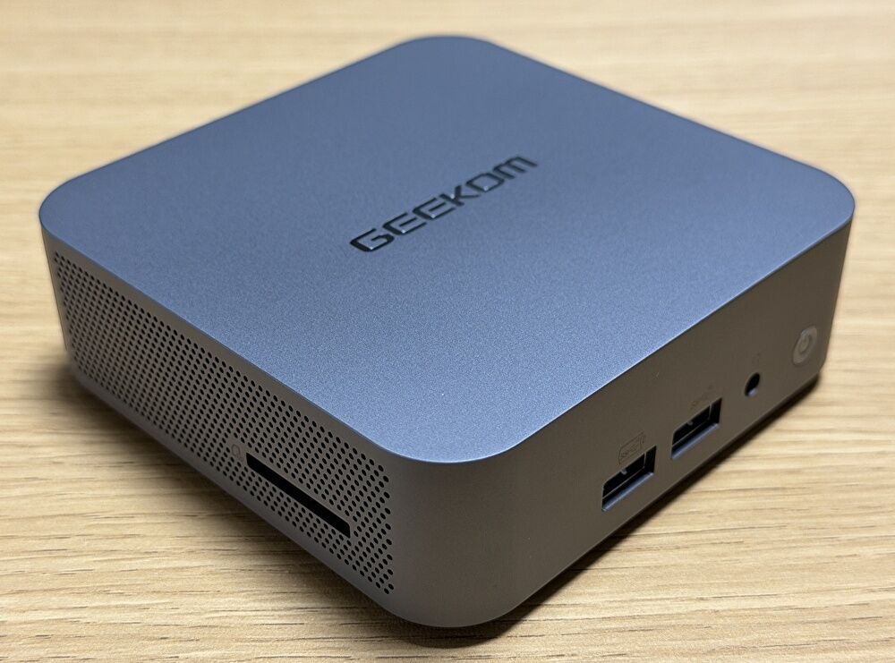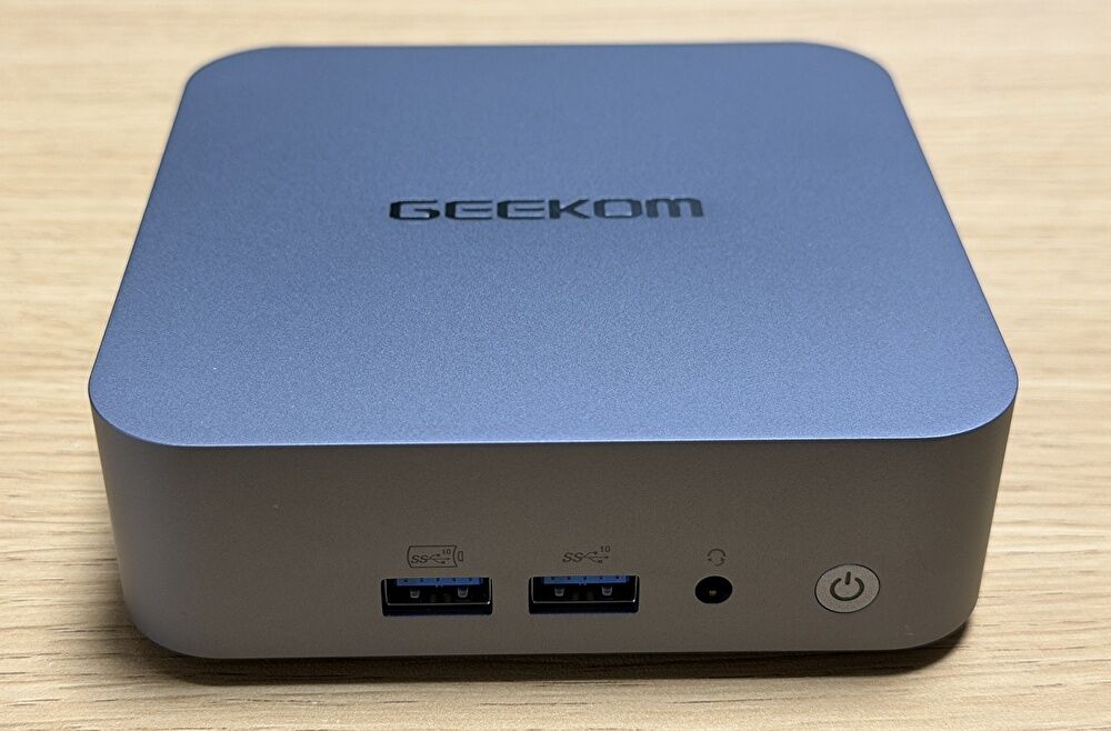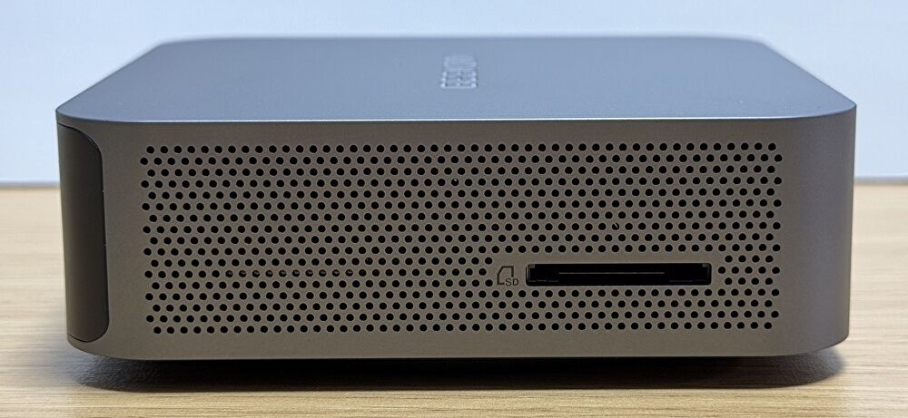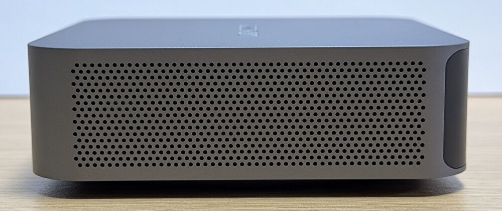 ▼本体の全体像です。開封してまず感じたことは、ハイエンドクラスのミニPCとしては、縦横・高さともにコンパクトであり、かつ、外枠の色・アルミ製の筐体とあわせて質感の高いこと。他社で言えば、同じくアルミ製筐体を採用する MINISFORUMの一部の製品やM4 Mac miniも質感が高いのですが、同水準 あるいは上回る質感の高さです。