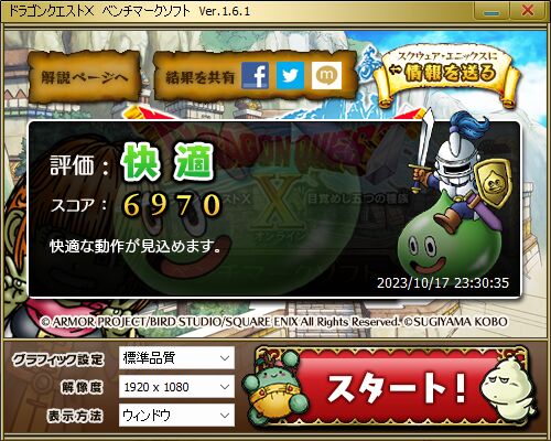 ドラクエベンチマークのスコアは「快適、6623」。何度か計測しましたが、2つめの画像のCore i9-12900HKよりも大幅に低いスコアです(要因は未確認です)。