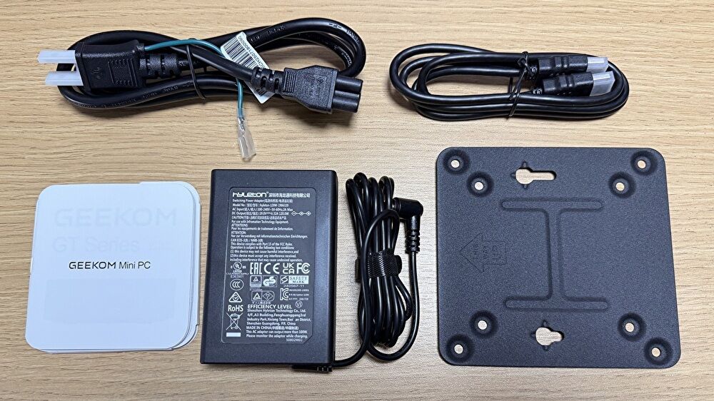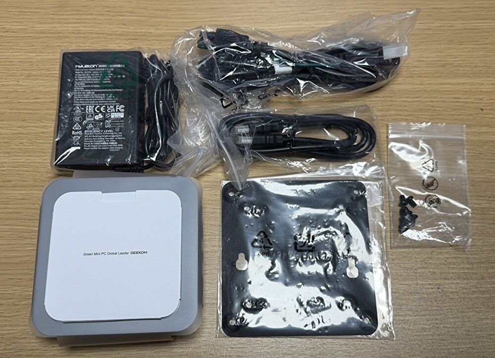▼ネジ以外をビニールから取り出しました。VESA マウントは、GEEKOMの他製品に付属の物も含めて、他社製品に付属のパーツよりもしっヵりとしています。