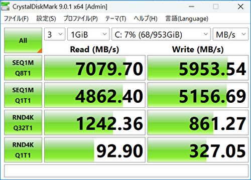 「Shenzhen WODPOSIT Technology、型番 WPBSN4M8-1TGP」のPCIe 4.0 x 4 1TB SSDの、CrystalDiskMarkでの読み書き速度です。「Read 7079MB/s、Write 5953MB/s」と、これまで私が実機レビューした市販のミニPC、デスクトップPC、ノートPCでは最も高いスコアです。
