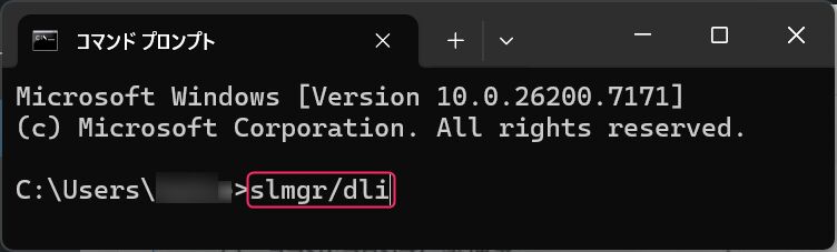 ▼コマンドプロンプトを起動し、最後の>のあとに「slmgr/dli」をコピペし、キーボードのエンターキーを押下します。