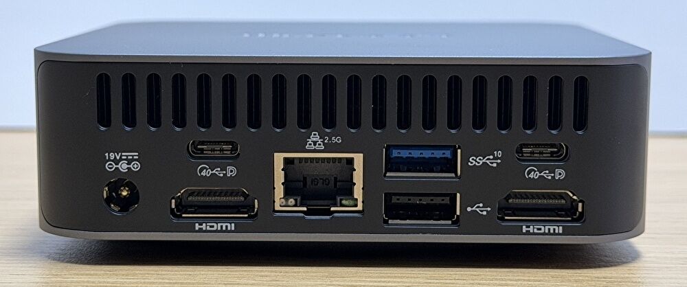 ▼背面のポート類は、専用のDCポート、USB4 x 2ポート、HDMI x 2 ポート、2.5G RJ45 有線LAN、USB-A 3.2 Gen 2、USB-A 2.0。上の通風孔側にヒートシンクとファンがあり、内部の熱はこちらから排出されます。