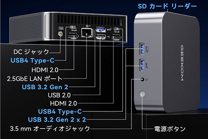 | ポート類 | HDMI x 2、USB4 x 2、USB-A 3.2 Gen 2 x 3、USB-A 2.0、RJ45 2.5G 有線LAN、SD カードリーダー |