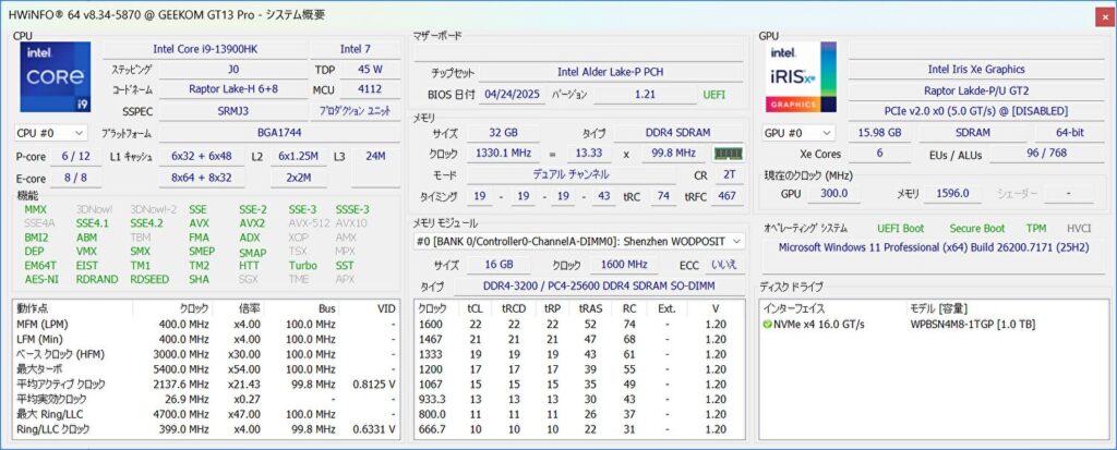 ▼上の画像からCPUの情報を拡大。Core i9-13900HKは、Pコア 6 Eコア 8の14コア 20スレッド、L3 キャッシュ 24MB、TDP 45W