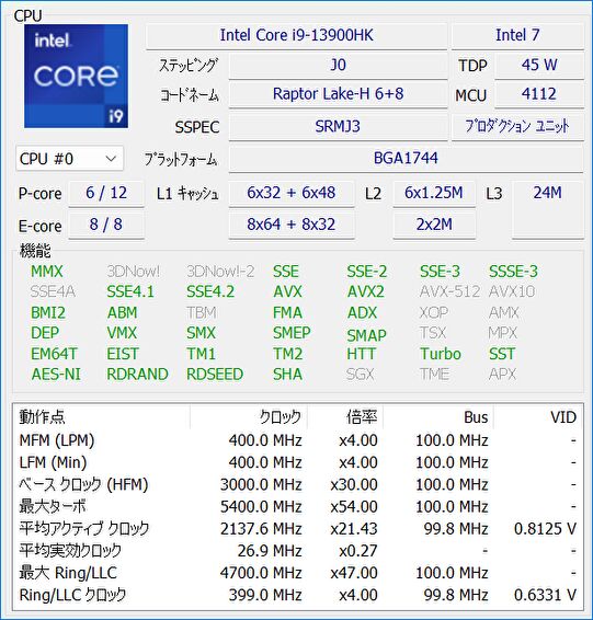 | CPU | Core i9-13900HK、14コア 20スレッド、最大 5.4GHz、L3 キャッシュ 24MB |
