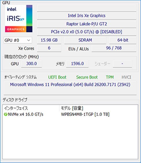 ▼GPUは統合型の Intel Iris Xe Graphics。Core Ultra シリーズ2では 統合型GPUの性能も高くなっていますが、Intel Iris Xe Graphicsは控えめです。