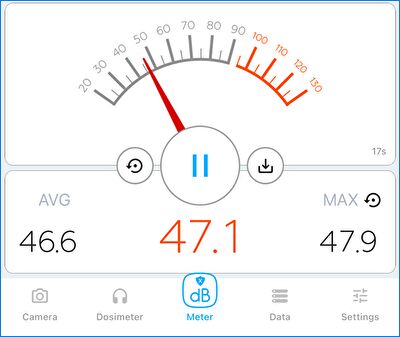 ▼CPU使用率を100%とした際の、iPhone アプリ「デジベル X」で計測のファン音量は 平均 約46dBと、やや喧しいです。ただし、負荷を下げると即静音、CPU温度も即 通常に戻るため、気にするほどではないとの認識です。