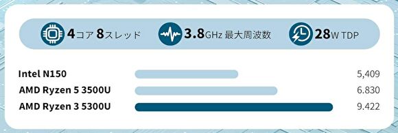 ▼販売ページにて、Ryzen 3 5300Uのベンチマークスコアが掲載されています。ソフトは明記されていませんが、別途確認したなかでは、Geekbench 5 CPU ベンチマークの指標は「シングルコア 1154、マルチコア 3232」。N100やN150のシングルコアのスコアが900台ですので、普段使いでは体感できるほどではないものの、多少の余裕があります。